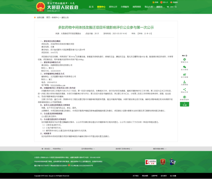 為保障公眾環(huán)境保護知情權、參與權、表達權和監督權。成都暉蓉生物科技有限公司在確定環(huán)境影響報告書(shū)編制單位為北京國寰環(huán)境技術(shù)有限責任公司的7個(gè)工作日內,通過(guò)大邑縣人民政府官網(wǎng)在網(wǎng)上進(jìn)行了公示,在項目征求意見(jiàn)稿編制完成后,通過(guò)圣諾生物官網(wǎng)進(jìn)行了網(wǎng)上公示,四川科技報公示,同時(shí)在項目所在地公眾易于知悉的場(chǎng)所張貼公告公示的方式進(jìn)行了公開(kāi)。