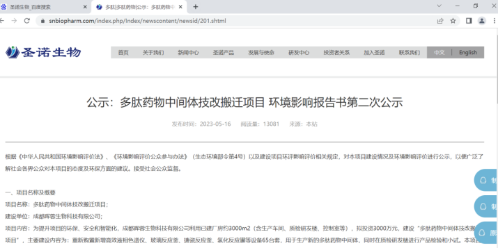 本項目在圣諾生物官網(wǎng)上進(jìn)行了征求意見(jiàn)稿網(wǎng)絡(luò )公示,時(shí)間為2023年5月16日~2023年5月30日(10個(gè)工作日)。圣諾生物官網(wǎng)為對外公開(kāi),易于公眾接觸及閱讀的網(wǎng)站。公示信息的網(wǎng)址為:
