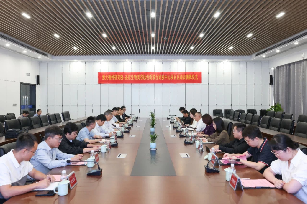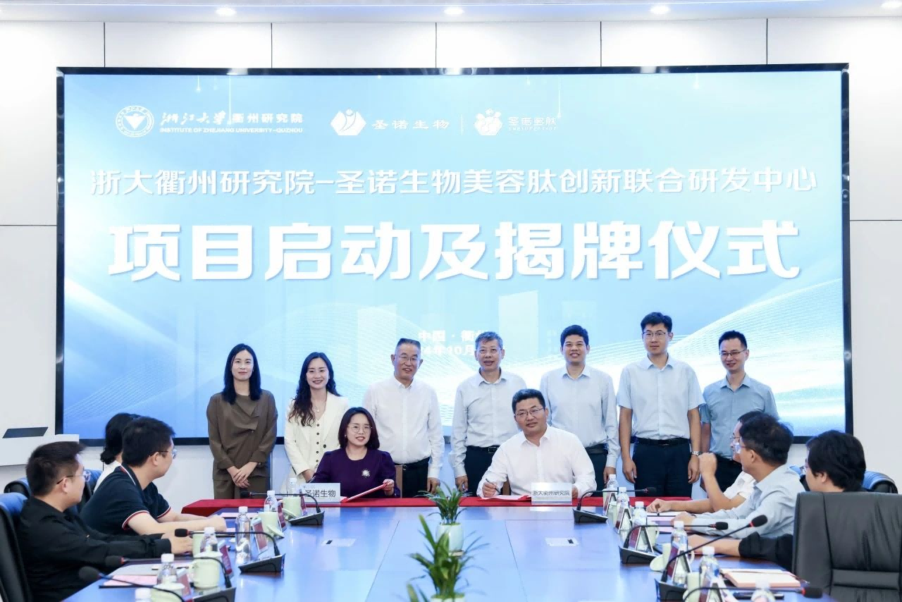 2024年10月14日,“浙江大學(xué)衢州研究院-圣諾生物美容肽創(chuàng )新聯(lián)合研發(fā)中心” 項目啟動(dòng)及揭牌儀式在浙江大學(xué)衢州常山港院區隆重舉行。